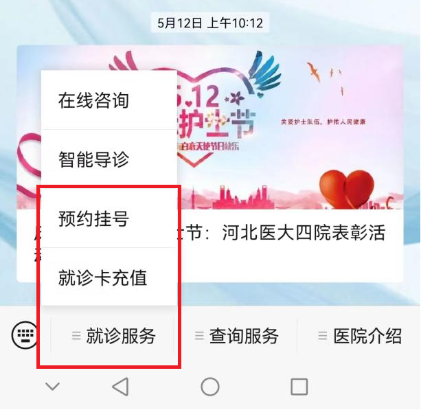 申领完电子健康卡后,可以在医院微信公众号中“就诊服务”菜单下的“预约挂号”、“就诊卡充值”进行预约、充值业务。
