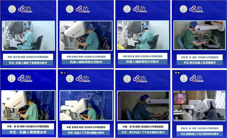 直播期间,我院田子强教授演示了机器人辅助下食管癌根治术,我院倪晓辰教授、师长进教授,河北医科大学第二医院的刘凯隆教授、张艳平教授,华北理工大学附属医院康绍叁教授、河北大学附属医院马涛教授,分别演示机器人肾部分切除术、肾癌根治术、远程机器人肾部分切除术等术式。上海交通大学医学院附属瑞金医院的赵国栋教授演示了机器人下胰十二指肠切除术,我院周涛教授演示了单孔机器人乳房重建术,我院赵群教授、邢台市人民医院霍志斌教授、河北工程大学附属医院赵国栋教授演示了3台机器人下胃肠癌根治术,我院张辉教授、赵喜娃教授分别演示了单孔机器人下子宫内膜癌分期术、远程机器人下全子宫双附件切除术、国产机器人下子宫内膜癌分期术和国产机器人全子宫双输卵管切除术